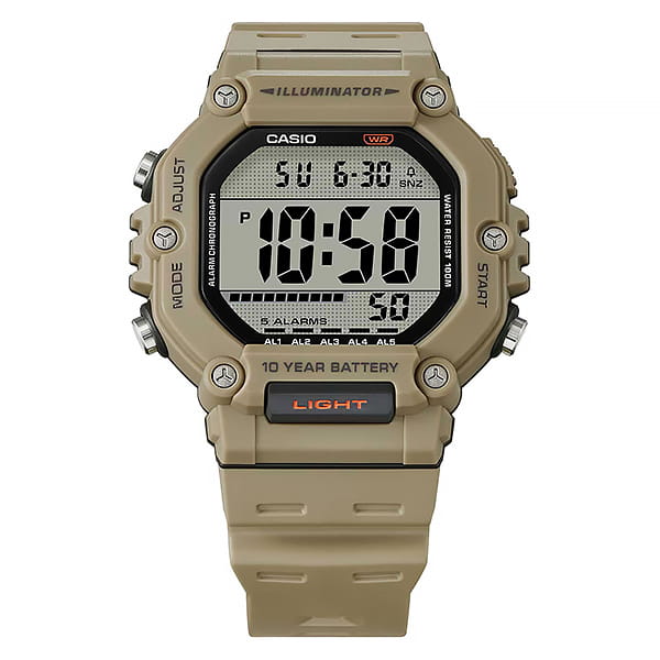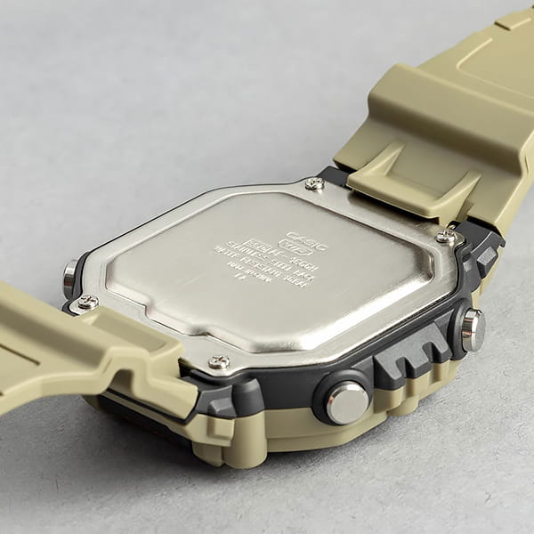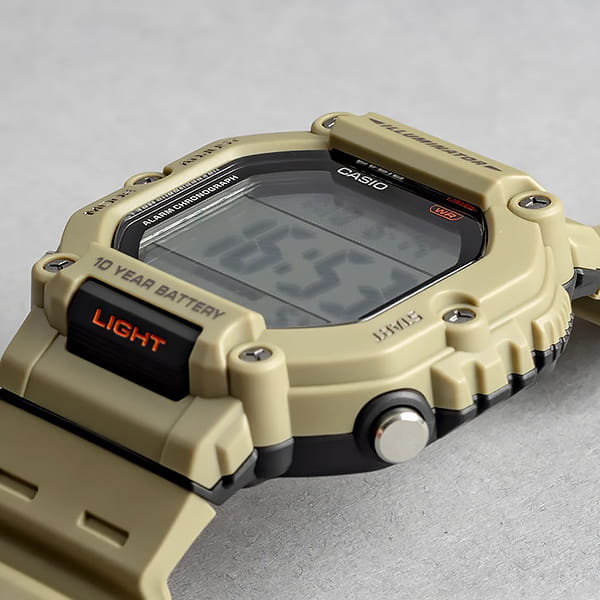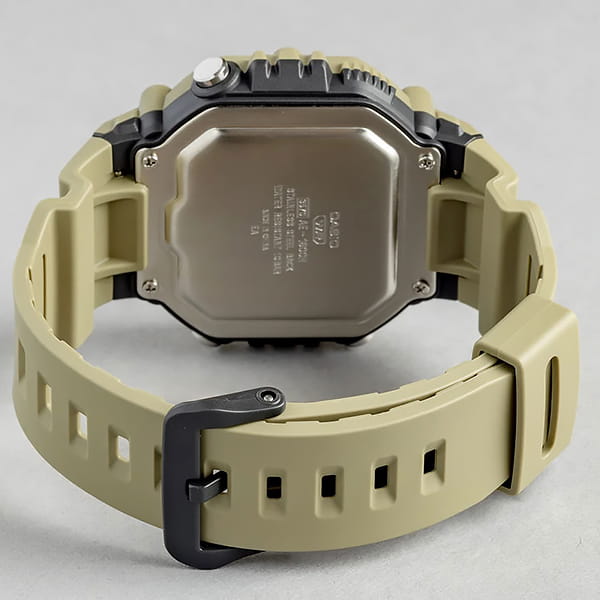 Спортивные мужские часы с квадратным корпусом. Основной цвет модели – бежевый. Большой ЖК дисплей подсвечивается светодиодом оранжевого цвета и имеет функцию послесвечения. Формат отображения времени 12 и 24-часовой. В часах есть 5 будильников (один из них с функцией Snooze) и ежечасный сигнал. Отображение второго часового пояса. Секундомер с точностью показаний 1/100с и временем измерения 24ч. SPLIT-хронограф. Таймер обратного отсчета от 1 минуты до 24 часов с автоповтором. Стальная задняя крышка крепится на 4-х винтах. Батарея рассчитана на 10 лет. Пластиковый ремешок с классической застежкой. Габаритные размеры корпуса 49,7 x 54,1 мм, толщина 15,9 мм, вес 52г