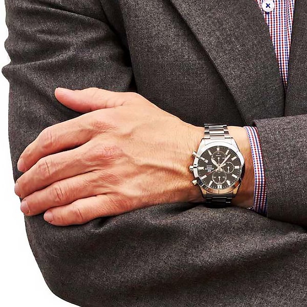 Крупный хронограф Casio с классическими нотками идеально впишется в повседневный и деловой образ современного мужчины. Часы полностью изготовлены из нержавеющей стали. Сапфировое стекло устойчиво к появлению царапин. На чёрном циферблате расположен секундомер с точностью показаний 1/10с и временем измерения 1 час. На крупные центральные стрелки и часовые метки в виде штрихов нанесено светонакопительное покрытие. Окошко даты находится в положении 4 часа. Литой браслет с тройной раскладывающейся застежкой, расстегиваемой одним касанием. Водонепроницаемость в соответствии с ISO 2281 - 100м, что позволяет плавать в часах без погружения. Габаритные размеры корпуса: 41 x 48мм, толщина 10,5мм. Примерный вес изделия - 135г. Срок службы батареи рассчитан на 3 года службы с момента установки (SR920SW)