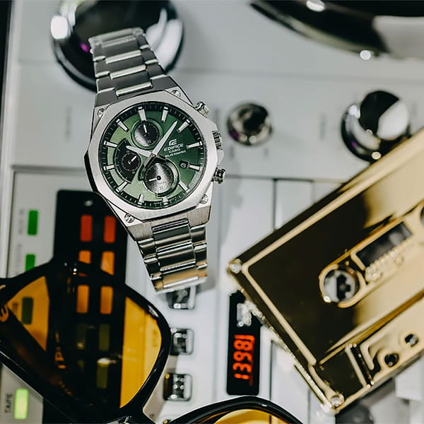 Японские часы с хронографом Casio EFS-S570D-3AUDF удобный аксессуар для любого мужчины. Корпус и браслет изготовлены из высококачественной нержавеющей стали. Ультратонкий корпус удобно лежит на запястье. Красивый зелёный циферблат притягивает взгляд. Широкие стрелки и часовые метки в виде штрихов с необритовым светонакопительным покрытием, которое обеспечивает длительное подсвечивание в темноте. Секундная стрелка вынесена в отдельный циферблат, расположенный в нижней части корпуса. Два дополнительных циферблата слева и вверху выполняю функцию секундомера – измеряют секунды и минуты в пределах одного часа. Окошко даты находится в положении 4 часа. Устойчивое к появлению царапин сапфировое стекло практически не видимо и имеет антибликовое покрытие. Питание часов обеспечивается энергией света, в нижней части циферблата установлен индикатор уровня зарядки батареи. Заводная головка с защитой. Водонепроницаемость в соответствии с ISO 2281 - 100м, что позволяет плавать в часах без погружения. Тройная раскладывающаяся застежка расстегивается одним касанием и имеет систему блокировки. Габаритные размеры корпуса: 44 x 49мм, толщина 9,7мм. Примерный вес изделия - 133г.