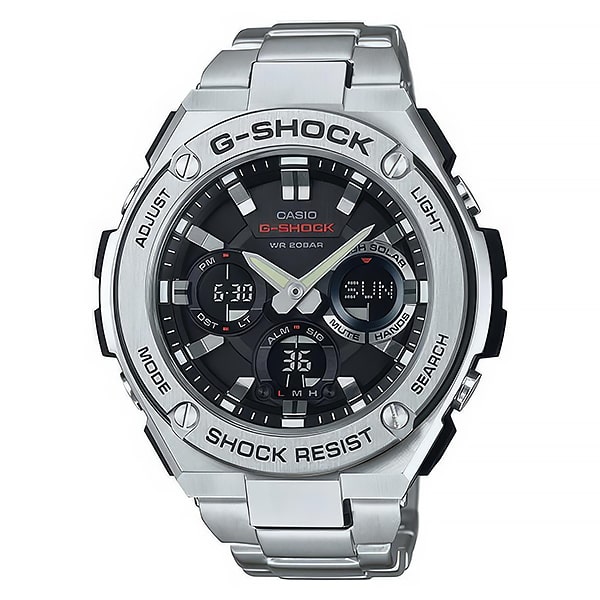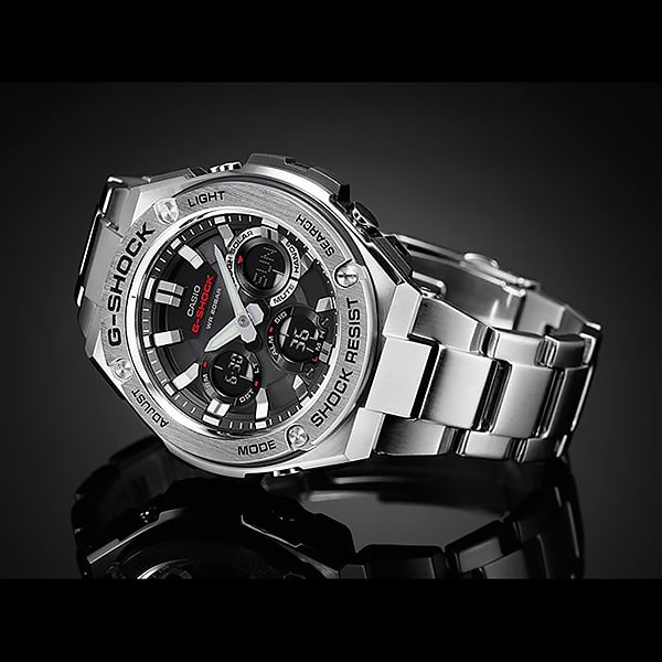 Сверхпрочные часы Casio G-SHOCK со стальным корпусом двухслойной конструкции и на стальном браслете воплотили в себе лучшие разработки и характеристики. Двойная светодиодная подсветка Super Illuminator белого цвета одновременно подсвечивает аналоговый циферблат и цифровой дисплей. Функция автоподсветки обеспечивает автоматическое включение светодиодной подсветки при наклоне часов в сторону лица. Время послесвечения при включении настраивается - 1,5 или 3 секунды. На стрелки дополнительно нанесено необритовое покрытие. Питание батареи обеспечивается аккумулятором большой мощности, который подзаряжается от солнечной энергии Tough Solar. Есть функции индикатора заряда батареи и автоматического сохранения энергии. Время работы аккумулятора без подзарядки приблизительно 8 месяцев, при включенной функции сохранения энергии приблизительно 19 месяцев.Ударопрочный двухслойный корпус - между слоями металла, в качестве амортизирующей прокладки, выступает полимер. Минеральное стекло.Секундомер с точностью показаний 1/100с и временем измерения 1ч. SPLIT-хронограф. Таймер обратного отсчета от 1 секунды до 100 минут. Мировое время – 48 городов (31 часовой пояс), всемирное координированное время (UTC).Включение/отключение летнего времени.Функции отключения/включения звука. Возможность принудительного перемещения стрелок для удобного просмотра информации на цифровых дисплеях. Габаритные размеры корпуса 52,4х59,1мм, толщина 16,1мм. Вес изделия 195г