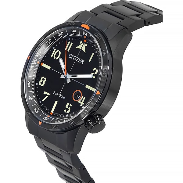 Мужские Citizen BM7555-83E — современные японские часы, сочетающие стильный дизайн и передовые технологии для динамичной жизни. Корпус и браслет выполнены из прочной нержавеющей стали с износостойким черным IP-покрытие, что обеспечивает долговечность и презентабельный внешний вид. На безель нанесены оранжевые стрелки компаса. Кварцевый механизм Citizen E111 работает по инновационной системе Eco-Drive: часы питаются от солнечной энергии и не требуют замены батарейки, а запас хода составляет до 180 дней. Черный циферблат украшен метками в виде штрихов и арабских цифр, а также оснащён шкалой компаса для дополнительного удобства. Стрелки с люминесцентным покрытием позволяют легко определять время даже в темноте. Окно даты и рифленая заводная головка расположены в районе 4 часов для максимального комфорта в использовании. Минеральное стекло защищает циферблат от царапин и повреждений. Водозащита до 100 метров делает модель отличным выбором для активного образа жизни. Удобная раскладная застёжка обеспечивает надежную фиксацию на запястье. Размер корпуса составляет 43 мм, толщина — 11,5 мм, вес — 145г