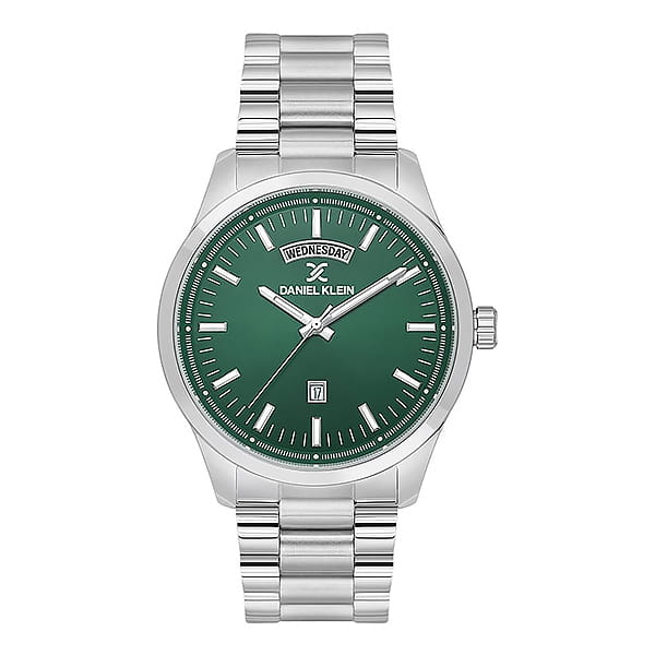 Элегантные мужские часы Daniel Klein DK.1.13817-3 воплощают в себе сочетание стиля и функциональности. Металлический корпус и браслет из нержавеющей стали с хромированными акцентами. Зелёный цвет циферблата добавляет уникальный стильный акцент. В верхней части циферблата окошко с отображением дня недели, в зоне 6 часов - квадратное окошко с датой. Часы работают от батарейки, а механизм EPSON (VX44E12W) гарантирует их точность и надежность. Браслет оснащён раскладывающейся застёжкой. Водозащита 50м. Габариты корпуса 43 х 43 х 11мм. Ширина браслета 22мм, длина по объёму -173мм. Вес – 130г