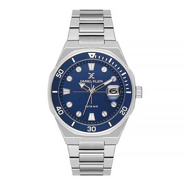 Мужские часы Daniel Klein DK.1.13989-2 выполнены в современном стиле дайверских моделей и идеально подойдут для стильного мужчины. Круглый корпус, синий циферблат, яркий безель, оформленный в цвет циферблата – все эти детали подчеркнут статус своего владельца. Все элементы на циферблате крупные и отлично читаются. На стрелки и часовые метки нанесено светонакопительное покрытие. Окошко даты с увеличительным стеклом расположено в зоне трёх часов. Корпус металлический (Alloy) с IP покрытием, задняя крышка и браслет – нержавеющая сталь. Браслет оснащён удобной застёжкой «бабочка» с двумя кнопками. Водонепроницаемость корпуса 5 Bar обеспечивает надёжную защиту от брызг и случайного попадания воды внутрь корпуса, но плавать в таких часах нельзя. Диаметр корпуса 43мм, толщина – 12мм. Приблизительный вес – 166г. Ширина браслета – 23мм, объём – 170мм
