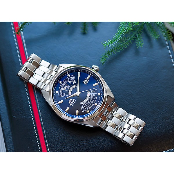 Функциональные мужские часы Orient RA-BA0003L10B с круглым корпусом и полным календарём будут отлично гармонировать с деловым и повседневным образом. В часах установлен японский механизм с автоподзаводом калибр F6D22, в котором 21 камень, частота 21600 полуколебаний в час, запас хода 40 часов, возможность ручного завода, а также функция stop-second (есть возможность остановить часовой механизм для установки времени с точностью до секунды). Циферблат с глубоким оттенком синего цвета выполнен по технологии Sunray (солнечные лучи). Метки в виде штрихов и центральные стрелки выполнены в серебристом цвете. Корпус и браслет изготовлены из нержавеющей стали высокого качества. Завинчивающаяся прозрачная задняя крышка позволяет любоваться точностью механического механизма. Браслет с раскладывающейся застежкой. Уровень водозащиты – 50м, что гарантирует защиту от попадания влаги внутрь корпуса при бытовом контакте с водой. Габаритные размеры корпуса 43,5х 50,2 мм, высота корпуса 11,5 мм. Ширина браслета – 22мм