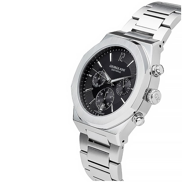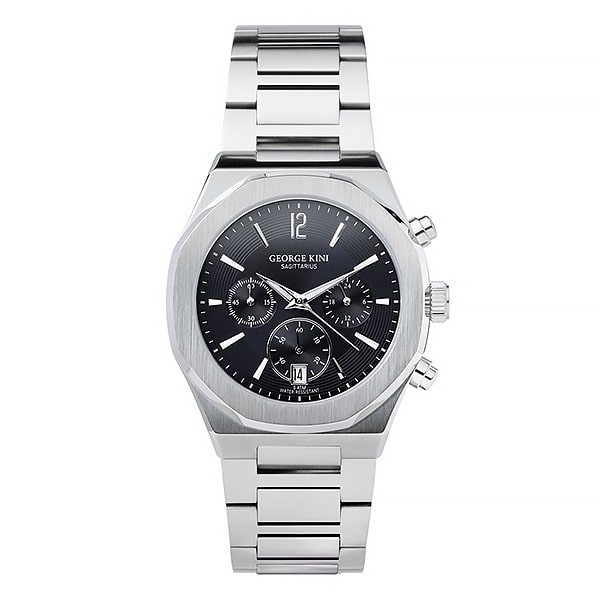 Мужские часы Sagittarius названы в честь символа бренда — лучник. Классический дизайн и разнообразие цветовых версий циферблата делают модель превосходным дополнением к гардеробу мужчины. GEORGE KINI GK.SG0001 это вариант с чёрным циферблатом с эффектом Sunray (солнечные лучи). В дополнительных маленьких циферблатах – секундомер и время в 24-часовом формате. Окошко с датой расположено в зоне 6 часов. На стрелки нанесено люминесцентное покрытие. Стоит подчеркнуть качество каждой детали этого аксессуара: сапфировое стекло, корпус и браслет из нержавеющей стали 316L, японский кварцевый механизм Chrono VD53. Браслет с застёжкой «бабочка». Водонепроницаемость 10 АТМ. Диаметр корпуса: 42 мм