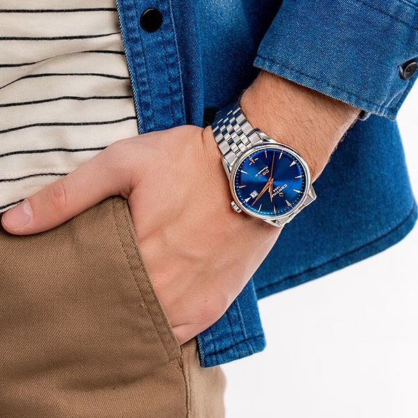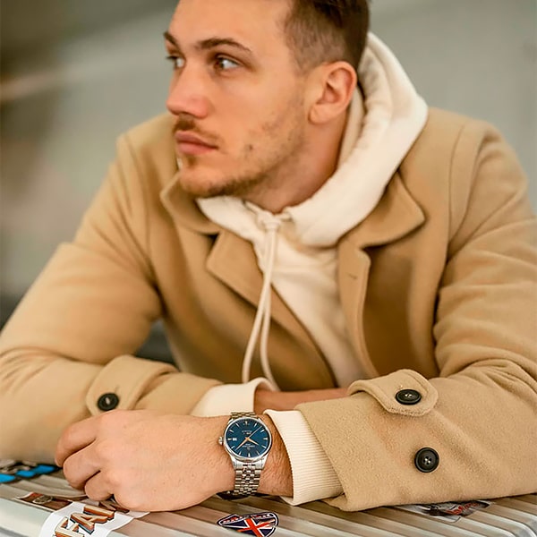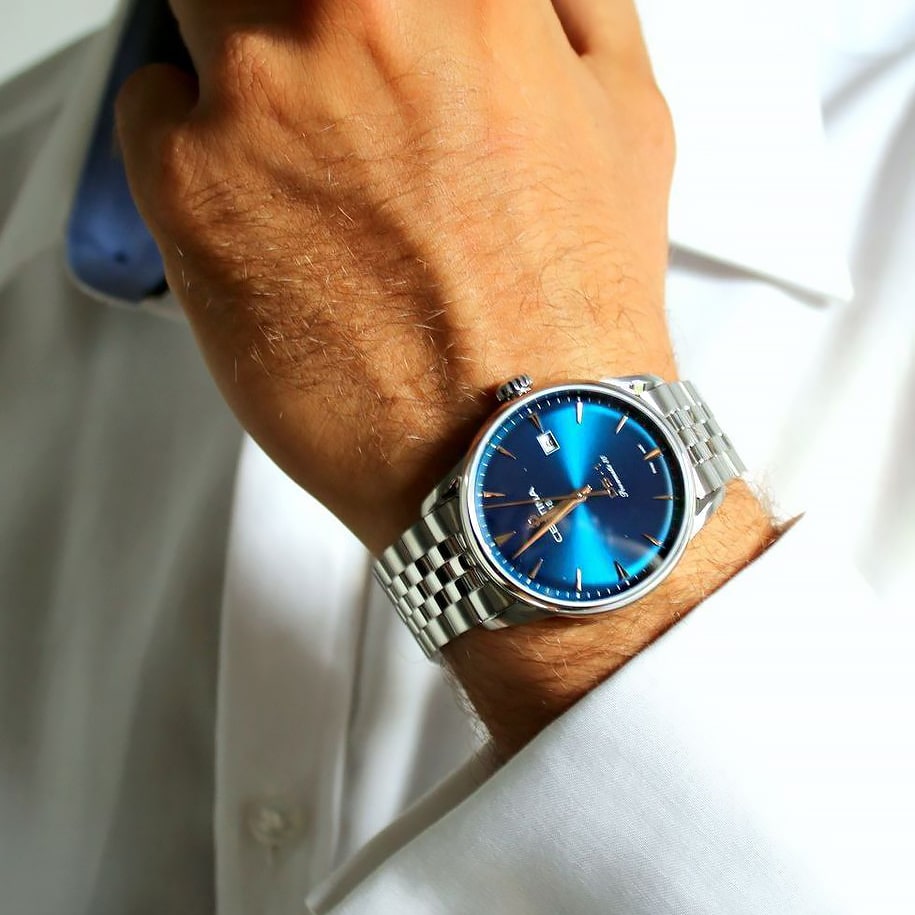 В этих мужских часах удачно сочетаются изысканный ретро-дизайн и инновационный механизм с автоматическим подзаводом и запасом хода до 80 часов. Корпус и безель сделаны из нержавеющей стали 316L. Стекло сапфировое с односторонним антибликовым покрытием. Браслет оснащен системой быстрой замены. Корпус часов выдерживает давление до 10 bar. Диаметр корпуса 40 мм, толщина – 10,98 мм. Ширина между креплениями браслета 20 мм. Приблизительный вес – 127г