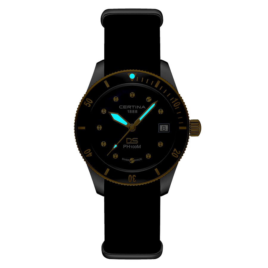 Женские часы швейцарского производителя Certina удачно сочетают в себе ретро-дизайн и гламурную женственность. Корпус сделан из нержавеющей стали 316L. Безель – сочетание стали и алюминия. Циферблат – чёрный перламутр. На стрелках и безеле - люминесцентное покрытие Superluminova. Стекло сапфировое с односторонним антибликовым покрытием. В часах установлен точный кварцевый механизм Precidrive™ (F06.412 ) с погрешностью до +/-10 секунд в год, что в 8–10 раз точнее обычных кварцевых часов и может сравниться с хронометрами. Также этот механизм оснащён функцией уведомления об окончания срока службы элемента питания (EQL). Кожаный ремешок с классической пряжкой. Корпус часов выдерживает давление до 10 bar. Диаметр корпуса 37,5 мм, толщина – 9,6 мм. Ширина между креплениями браслета 18 мм. Приблизительный вес – 60г