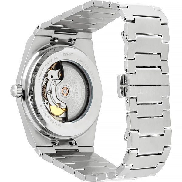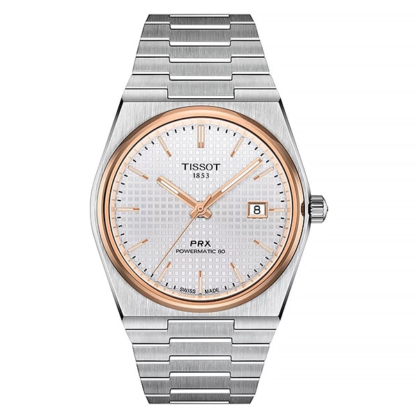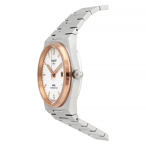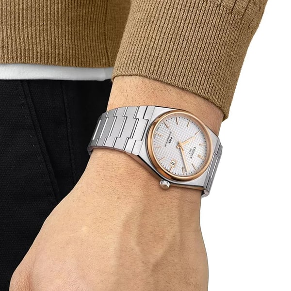Мужские наручные часы Tissot PRX Powermatic 80 порадуют поклонников ретро-дизайна. Автоматический механизм с запатентованной пружиной баланса Nivachron имеет запас хода до 80 часов (d механизме 23 камня, частота 21600 полуколебаний в час). Корпус и браслет изготовлены из нержавеющей хирургической стали и имеют сатинированную поверхность. Безель и элементы циферблата оформлены в цвет розового золота. Циферблат украшен узором Clous de Paris. На прямоугольные стрелки в стиле Baton и накладные часовые метки в виде штрихов нанесено люминесцентное покрытие, которое светится в темноте даже после непродолжительной зарядки на свету. Окошко даты расположено в области трёх часов. Сапфировое стекло с антибликовым покрытием. Прозрачная задняя крышка позволяет насладиться видом работающего механизма. Надежный стальной браслет с раскладывающейся застежкой и системой быстрой замены. Размер корпуса 40х39,5 мм, высота корпуса 10,9 мм. Вес – 138 г.