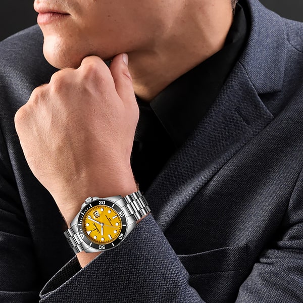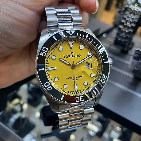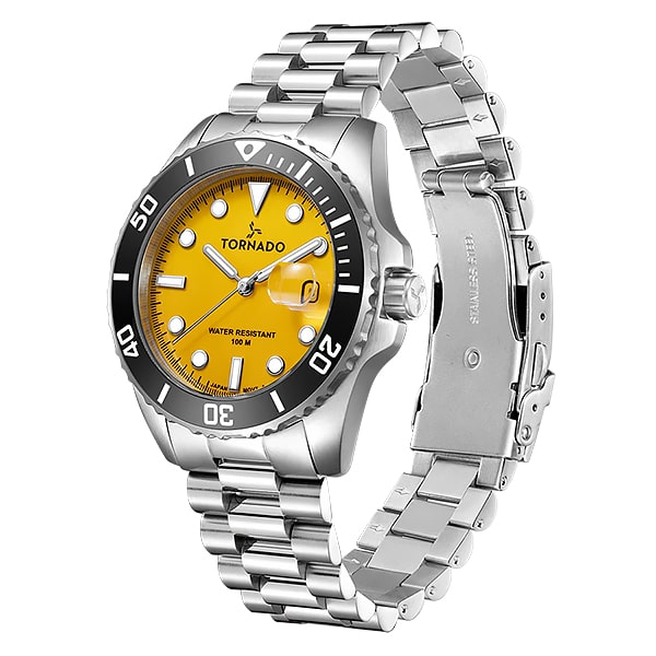 Мужские наручные часы Tornado - известного американского бренда с мировым именем, который уже завоевал доверие покупателей. Аналоговый способ отображения времени с ярким желтым циферблатом и отметками делает его удобным и легко читаемым. Серебристый корпус из нержавеющей стали и хромированный браслет отлично сочетаются друг с другом. В часах установлен японский кварцевый механизм Miyota 2115. Яркие стрелки и часовая индикация со светонакопительными элементами. Окошко с датой с увеличительным стеклом. Стекло минеральное имеет сапфировое покрытие, которое надёжно защищает от появления бытовых царапин. Водонепроницаемость корпуса 100м позволяет плавать в часах. Габаритные размеры корпуса 42x42x13 мм. Приблизительный вес – 155г. Ширина браслета 22мм, объём 195см.