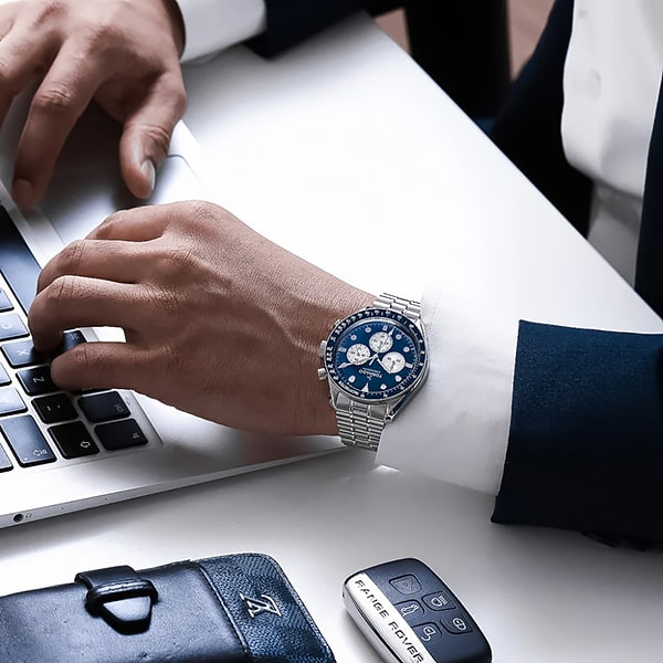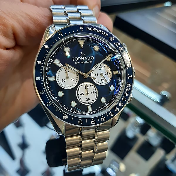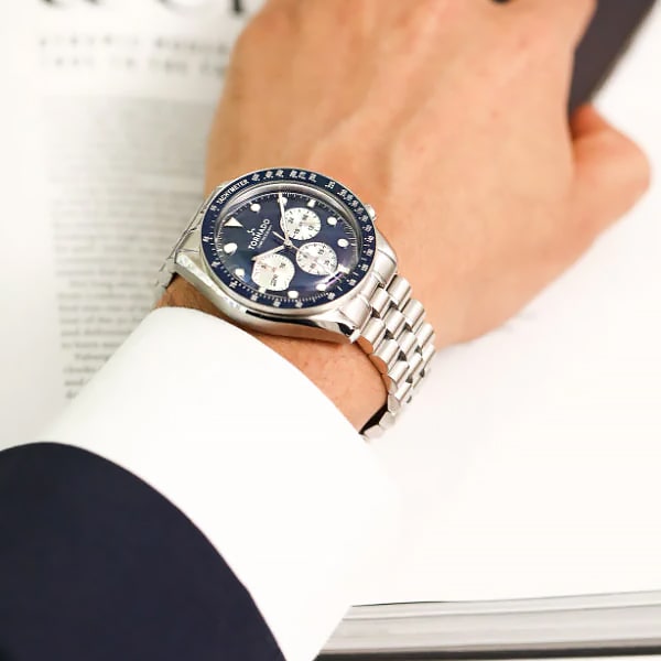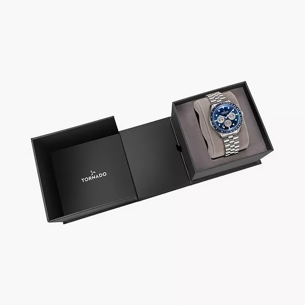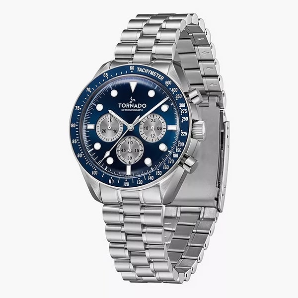 Мужские часы с хронографом Tornado Cosmic Chrono T22103-SBSN с синим циферблатом, серебряным корпусом и браслетом, сделанными из высококачественной нержавеющей стали 316L. Синий циферблат. Дополнительные стрелки на циферблате выполняют функцию хронографа и отображают время в 24-часовом формате. По безелю корпуса нанесена тахиметрическая шкала. Японский кварцевый механизм Miyota JS20 – обеспечивает точность и надёжность. На стрелки и часовые метки нанесено люминесцентное покрытие Superluminova. Минеральное стекло с сапфировым стеклом – обеспечивает надёжную защиту от появления царапин. Браслет фиксируется на запястье с помощью удобной раскладывающейся застежки с кнопкой. Водозащита 5 ATM. Диаметр корпуса часов 42 мм, высота 15 мм. Ширина крепления ремешка к часам 20 мм. Общая длина браслета 185 мм. Часы прекрасно подойдут под повседневный образ или строгий костюм.
