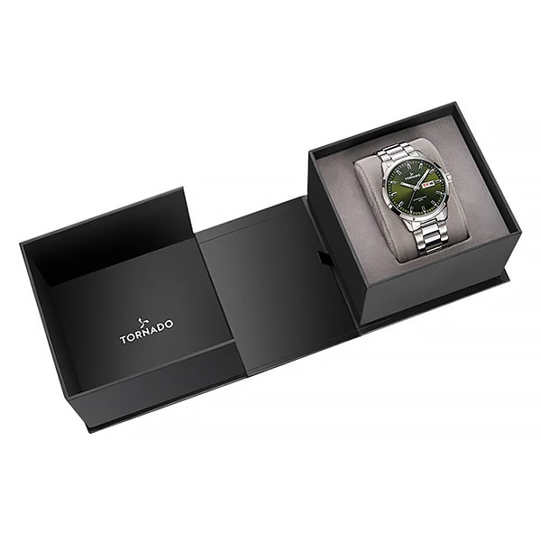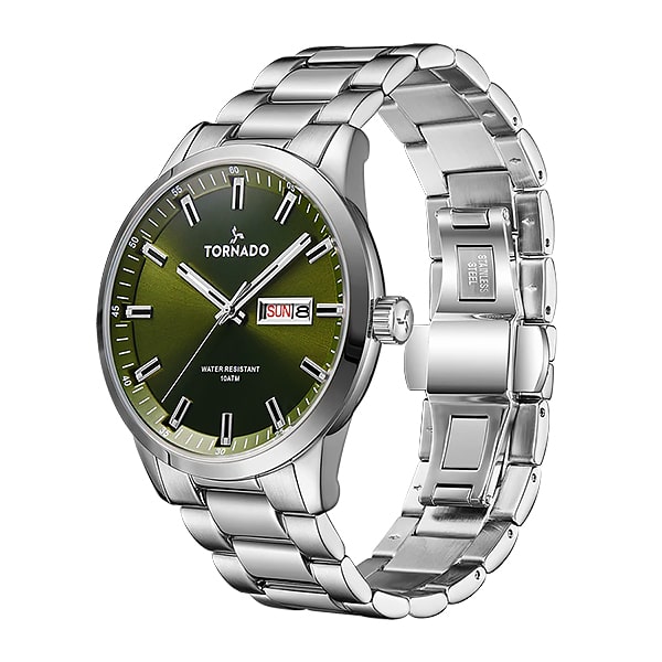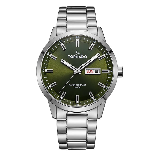 Мужские часы Tornado SPECTRA Analog Watch T23001-SBSH – это часы с выразительным зелёным циферблатом в классическом стиле, которые станут универсальным аксессуаром для современного мужчины. Стальной хромированный корпус и браслет. Минеральное стекло с сапфировым стеклом – обеспечивает надёжную защиту от появления царапин. На зелёном циферблате индикация в виде штрихов и акцентированные стрелки. Календарь показывает день недели и дату, расположен в зоне 3 часов. Кварцевый механизм Miyota 2305 обеспечивает точность хода. Водозащита 10 ATM гарантирует надёжную защиту от попадания влаги во внутрь корпуса. Габаритные размеры корпуса - 43×43×12 мм. Ширина браслета 22мм, длина по объёму – 158мм. Примерны вес изделия – 136г